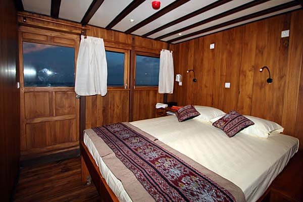 Five double bed (14m²) and 2 single cabins (8m²) are on the lower deck, while the other three double cabins (13m²) are located on the upper deck. All cabins are equipped with individual controlled air conditioner plus an extra fan, minisafe, en-suite bathroom with hot/cold water shower and western toilet.