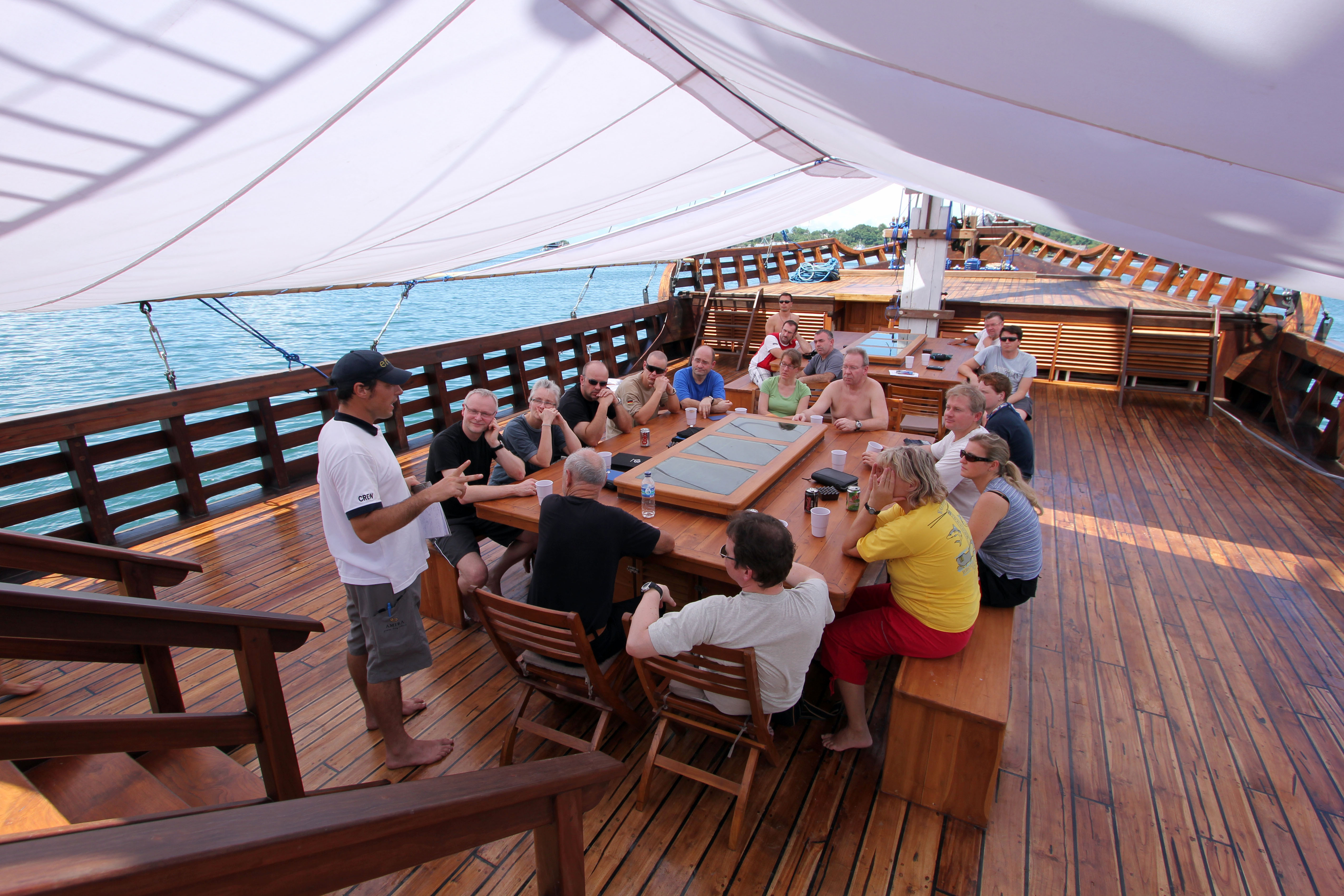 Amira was built with locally grown timber by indigenous crafts men using ancient Pinisi boat building traditions. She is equipped with a state of the art navigation system, security and rescue equipment and technology. With a length of 52 meters Amira offers 8 comfortable double cabins and two single cabins, all equipped with personal showers and toilets and natural lighting. There is a cozy restaurant, a romantic lounge area and a huge sun deck and… and… and…a dream boat, our dive boat.