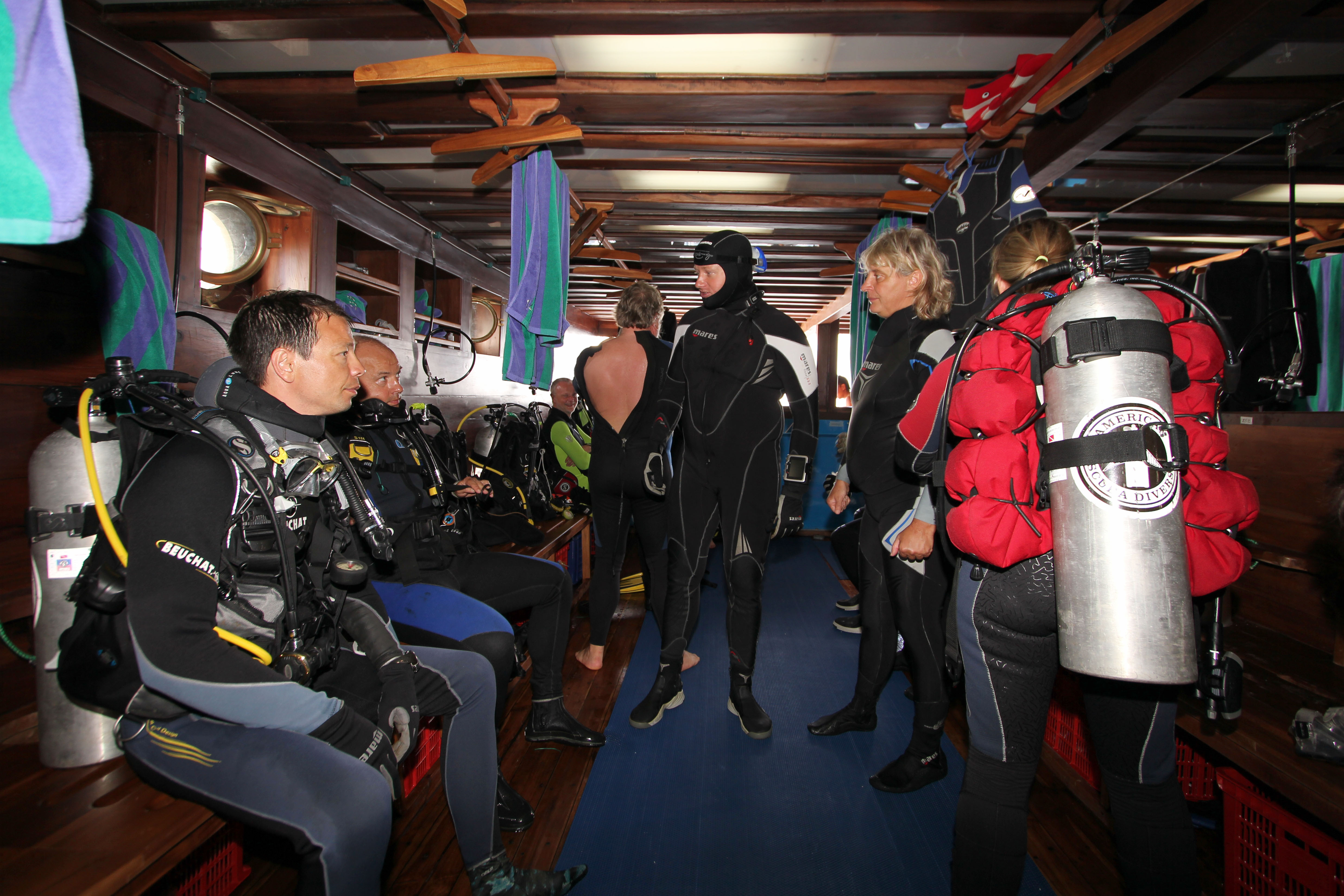 A regular dive day on the Amira consists of usually four dives (3 during day time, 1 at night). Exceptions may occur (e.g. first and last day of a trip, crossings, and unfavorable weather conditions). Extensive debriefing takes place on the nature of each dive site before heading out to sea with the three dinghies. Every dinghy is equipped with a radio transmission system, emergency oxygen tanks and each diver wears an ENOS homing device. A carefully chosen and well trained dive guide is assigned to every group (4-5 divers). Nitrox (32%) and Nitrox courses are available for a fee.
