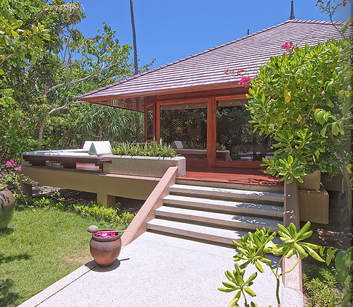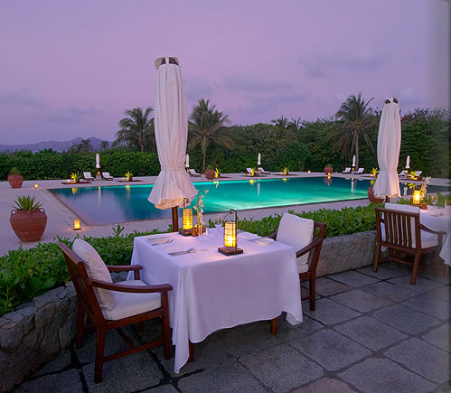 A garden walkway leads down from the pool to the white-sand beach and Amanpulo’s Beach Club. The open air pavilion is a tranquil setting. Mattresses and pillows are spread out on the deck, facing the sea. Shade umbrellas and reclining lounge chairs line the beach. Breakfast, lunch, dinner, snacks and refreshments are also offered at the Beach Club. Fresh seafood and Spanish cuisine are specialties.