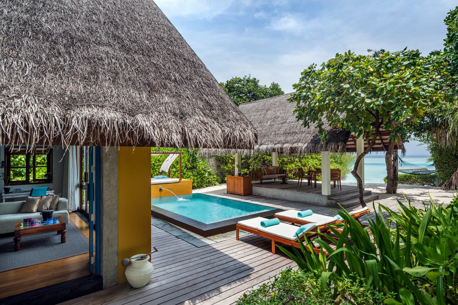 The entry level of accommodation is the Beach Bungalow, which comprises an airconditioned living and sleeping pavilion with a lounge and dressing room. The extensive bathroom houses a bath, indoor shower and a traditional outdoor Maldivian shower. The bungalow opens onto a private garden with an outdoor deck, a 5-metre plunge pool with sunbed and a gazebo.