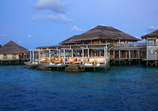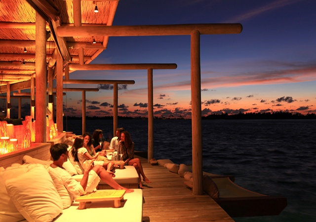 Sea breezes drift among the rustic woods under high palm-thatched roofs at Laamu’s six bars and restaurants, most set over water.