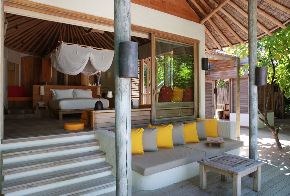 Six Senses Laamu is the only resort in the Laamu Atoll, deep in the Indian Ocean. Just an inter-island plane trip from Malé International Airport and a short boat ride brings you to a place where dolphins swim. The resort is a combination of on-land and over-water villas constructed of sustainable materials and set around the palm-fringed paradise.