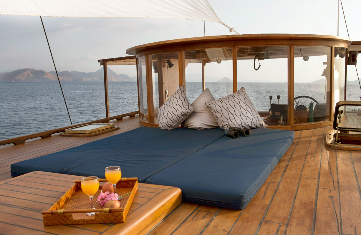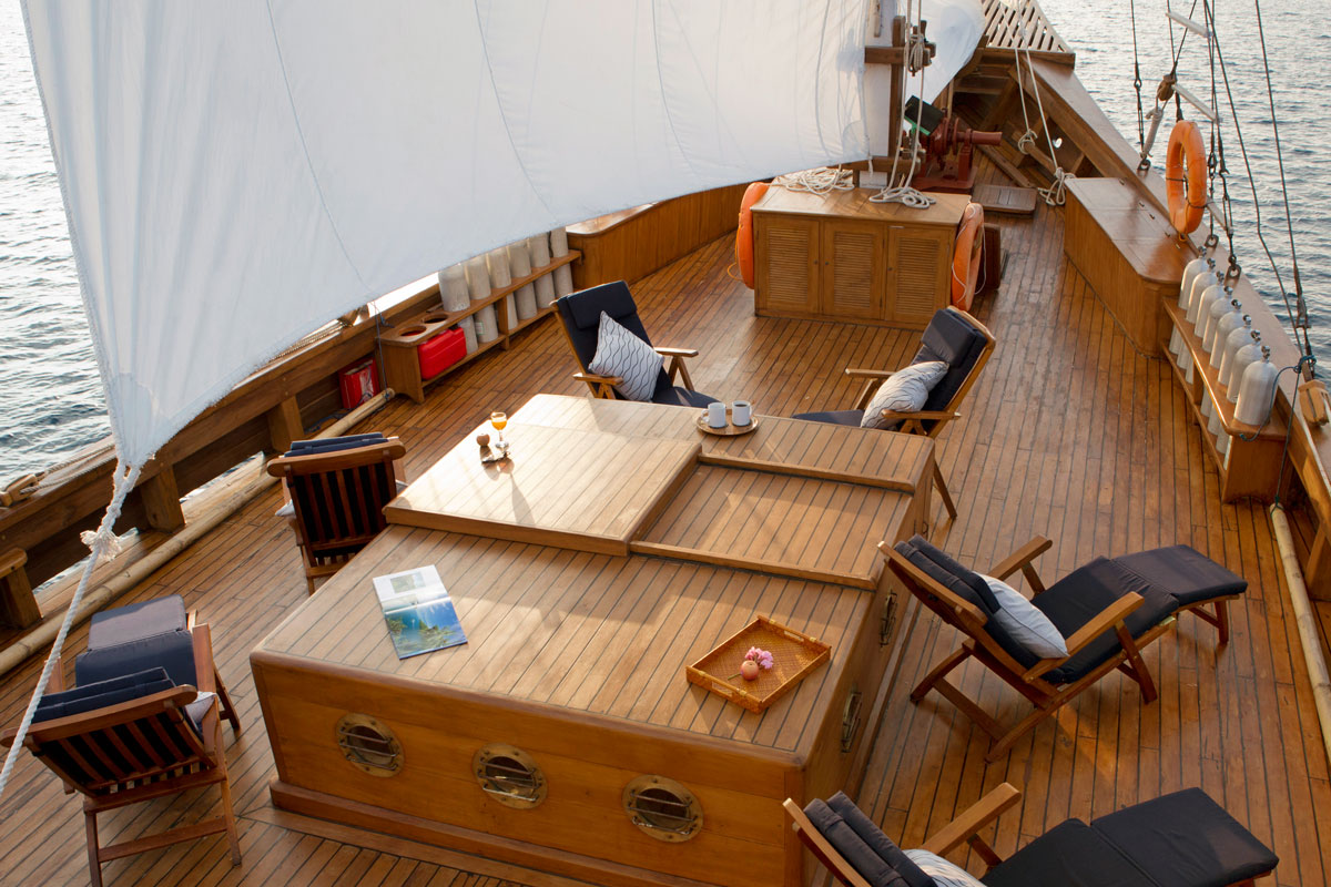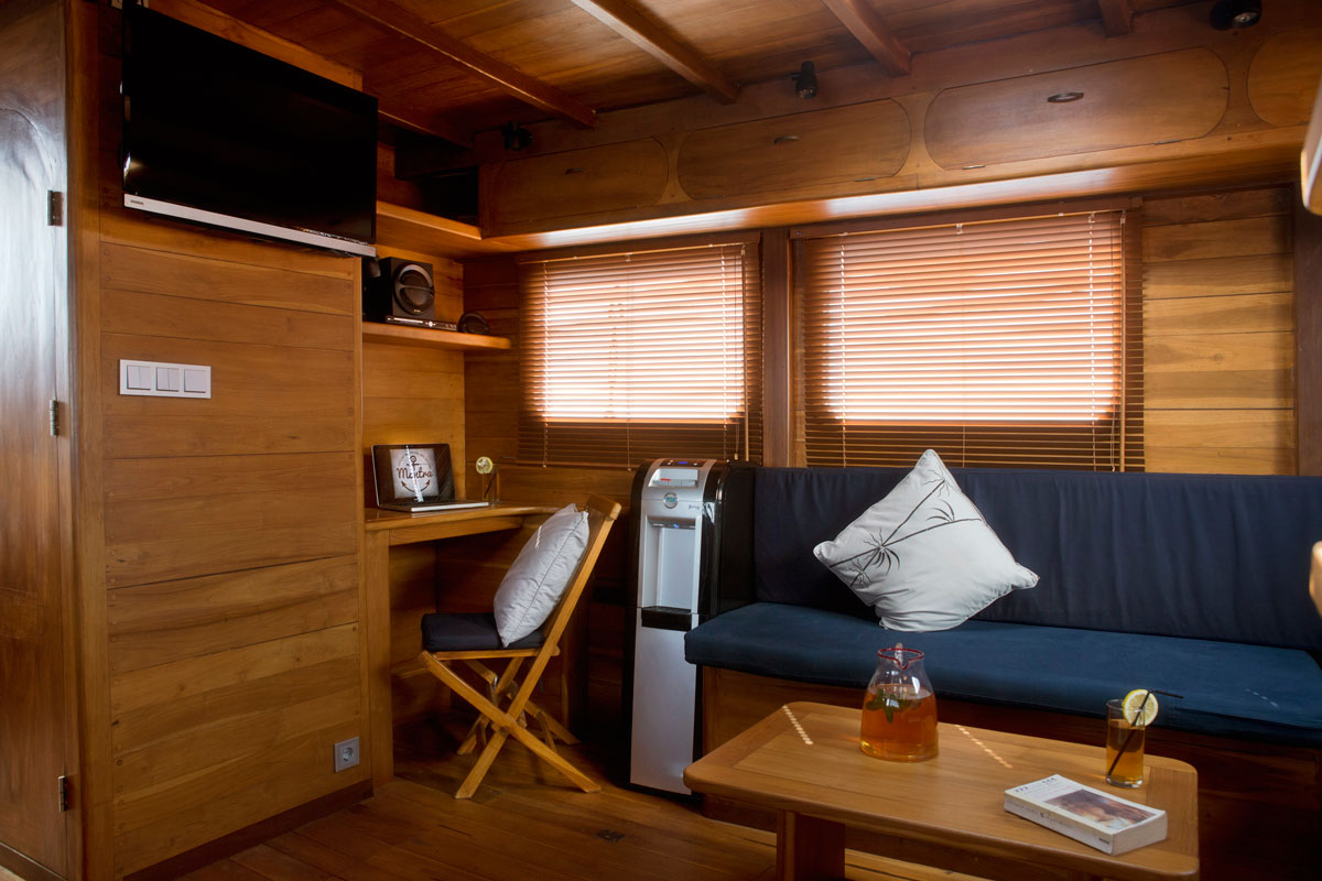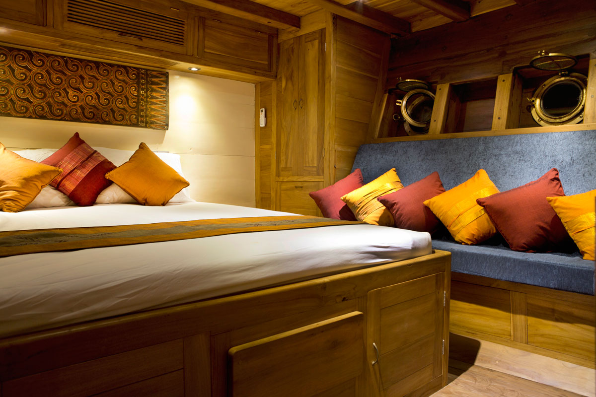 The yacht features three cabins, each with private bathroom and AC. The teak wood interior is toned with traditional Indonesian patterns giving the feeling of warmness and comfort. Each cabin consists of Queen size bed and one or two bunk single beds on the sides. The Cabins are cleaned daily, with towel and sheets changed on your request, with a desired frequency.