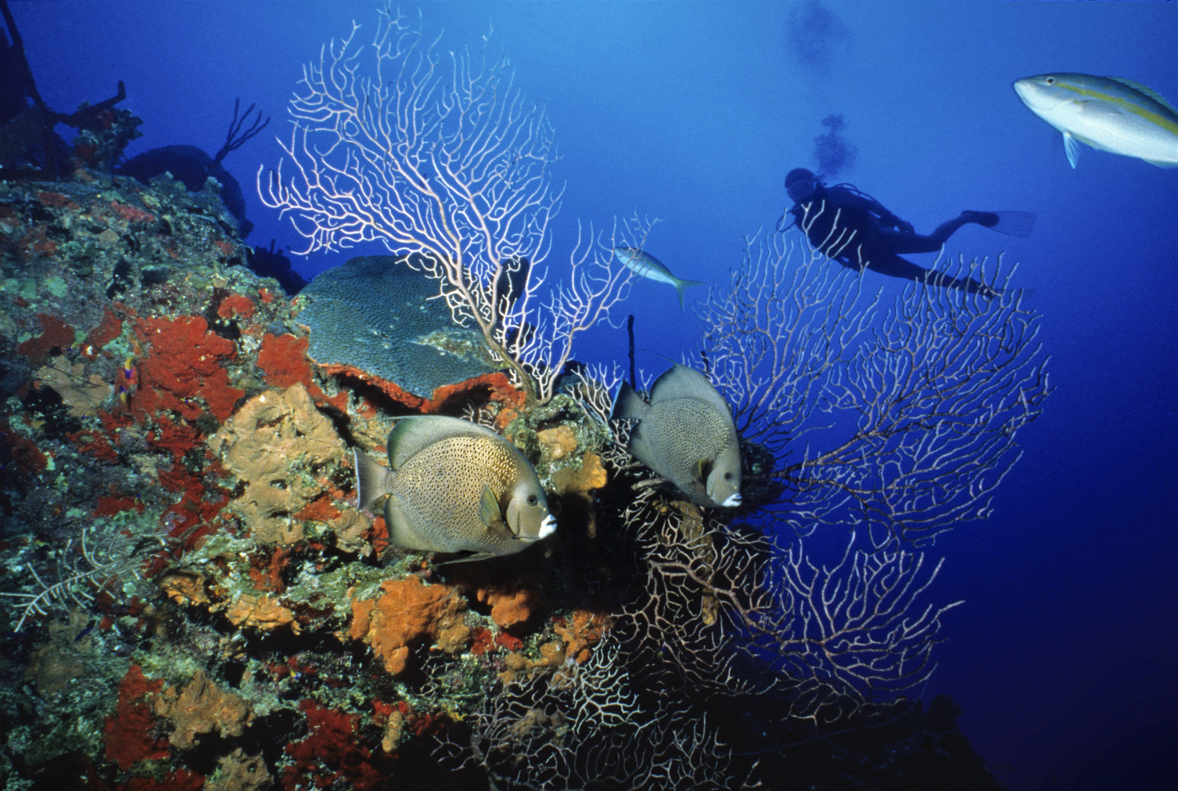 Rising from the ocean bed in the clear waters of the northern Caribbean Sea lies a massive underwater mountain range known as the Cayman Ridge. Three of its spectacular peaks break the surface of the water to form the islands of Grand Cayman, Cayman Brac and Little Cayman. To the north lies the island of Cuba and to the east Jamaica. The water is deliciously warm and the diving is easy. No rivers deposit sediment into the crystal clear waters that are said to be amongst the least polluted in the world. The islands are surrounded by fringing reefs with staghorn coral, canyons, pinnacles, archways and of course, the magnificent walls that provide the necessary protection for all varieties of marine life while still enabling the larger pelagic species to come within reach of the diver. Because diving is such a major part of the tourist industry, diving in the Cayman Islands has become highly organized and very professionally run. The diving industry, together with the government, formed the Cayman Islands Watersports Operators Association (presently called the Watersports Sector of the Cayman Islands Tourism Association CITA), which sets the highest standards in diving safety, boat operation and diving guides. The creation of permanent mooring sites and continuing environmental education all help to preserve the health and delicate ecology of the reefs and their associated marine life.