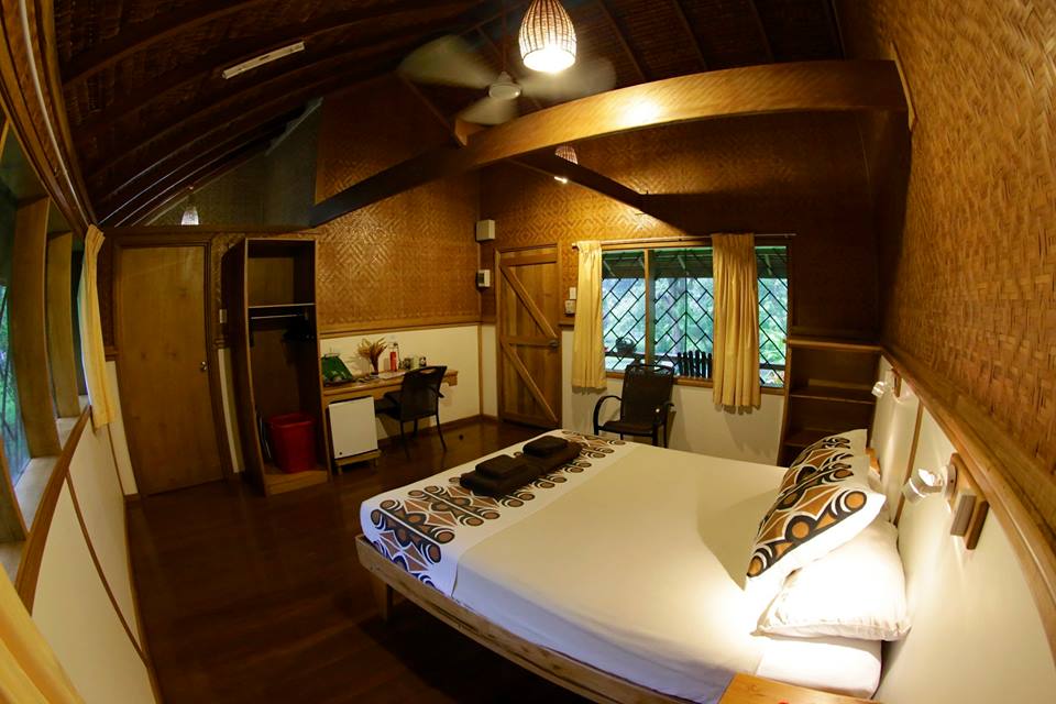 Walindi Resort offers 12 traditional style, self-contained bungalows spread along the beachfront, and 8 Plantation House Rooms, all surrounded by rainforest gardens. Bungalow facilities include ensuite bathrooms, ceiling fans, large windows to catch the tropical breezes, kitchenette with tea and coffee making facilities, and private verandas overlooking the beach and gardens. Plantation House Rooms are in blocks of 4 rooms, slightly smaller than the bungalows and with all the same facilities, except each block of four rooms share one verandah.
