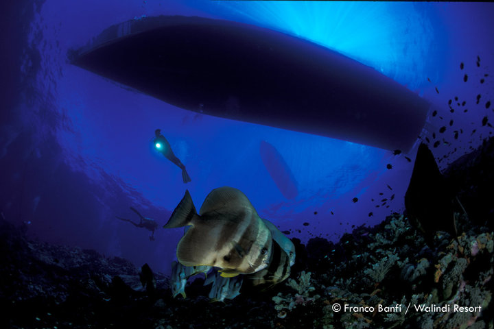 On days when the current is creating eddies on the point, schools of barracuda, trevally, sea perch, fusilier, unicorn fish and surgeon fish mix with a variety of shark species, including, on occasion, scalloped hammerhead, and tuna, resulting in plenty of exciting action.
