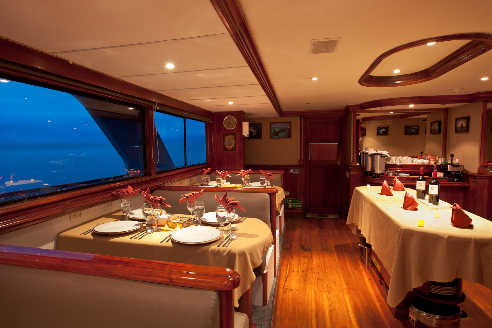 The elegant M/V Galapagos Sky is fully air conditioned and features a spacious lounge area and separate fine dining area. Two dive masters and up to four dives a day ensure that your voyage will have ample underwater time to discover the magic of Galapagos diving.