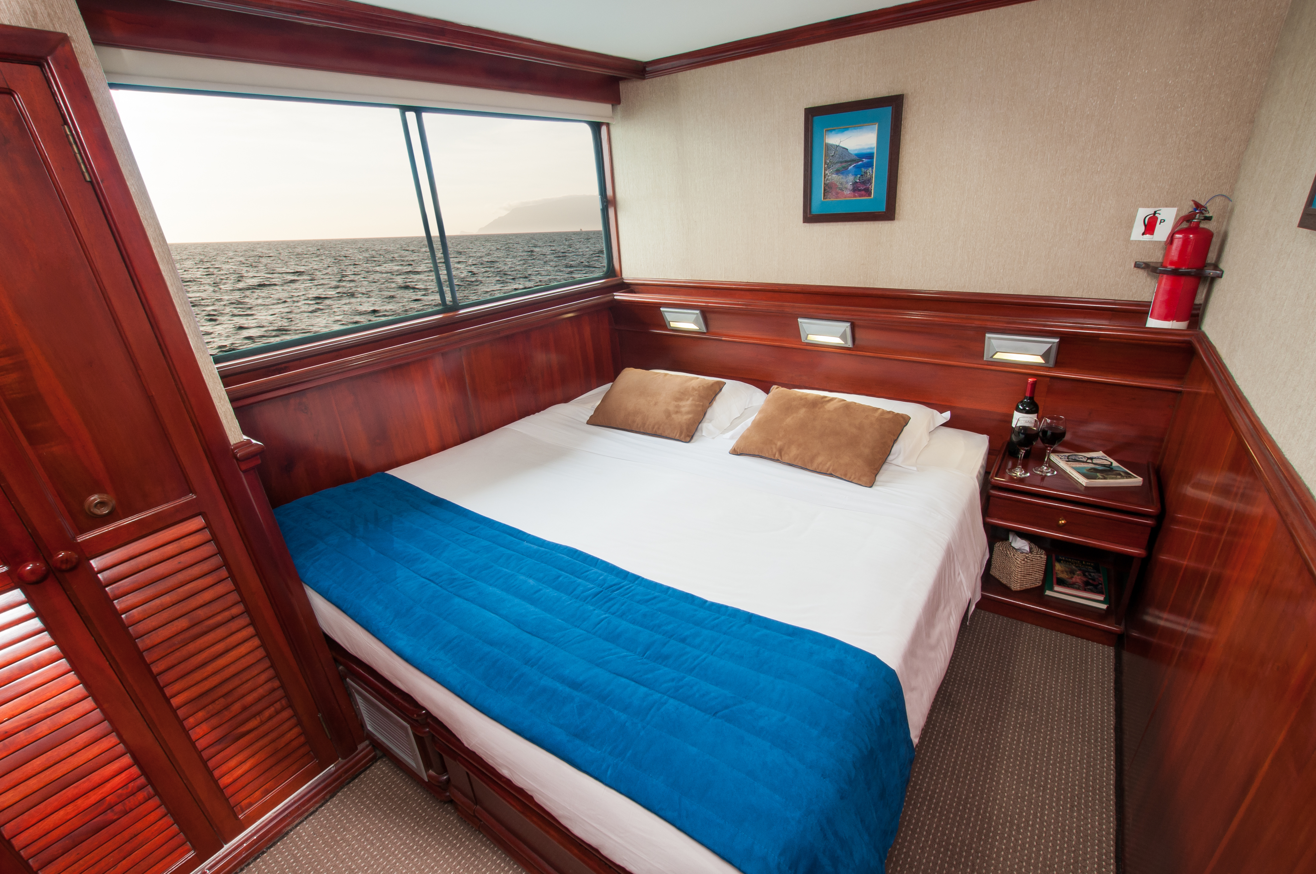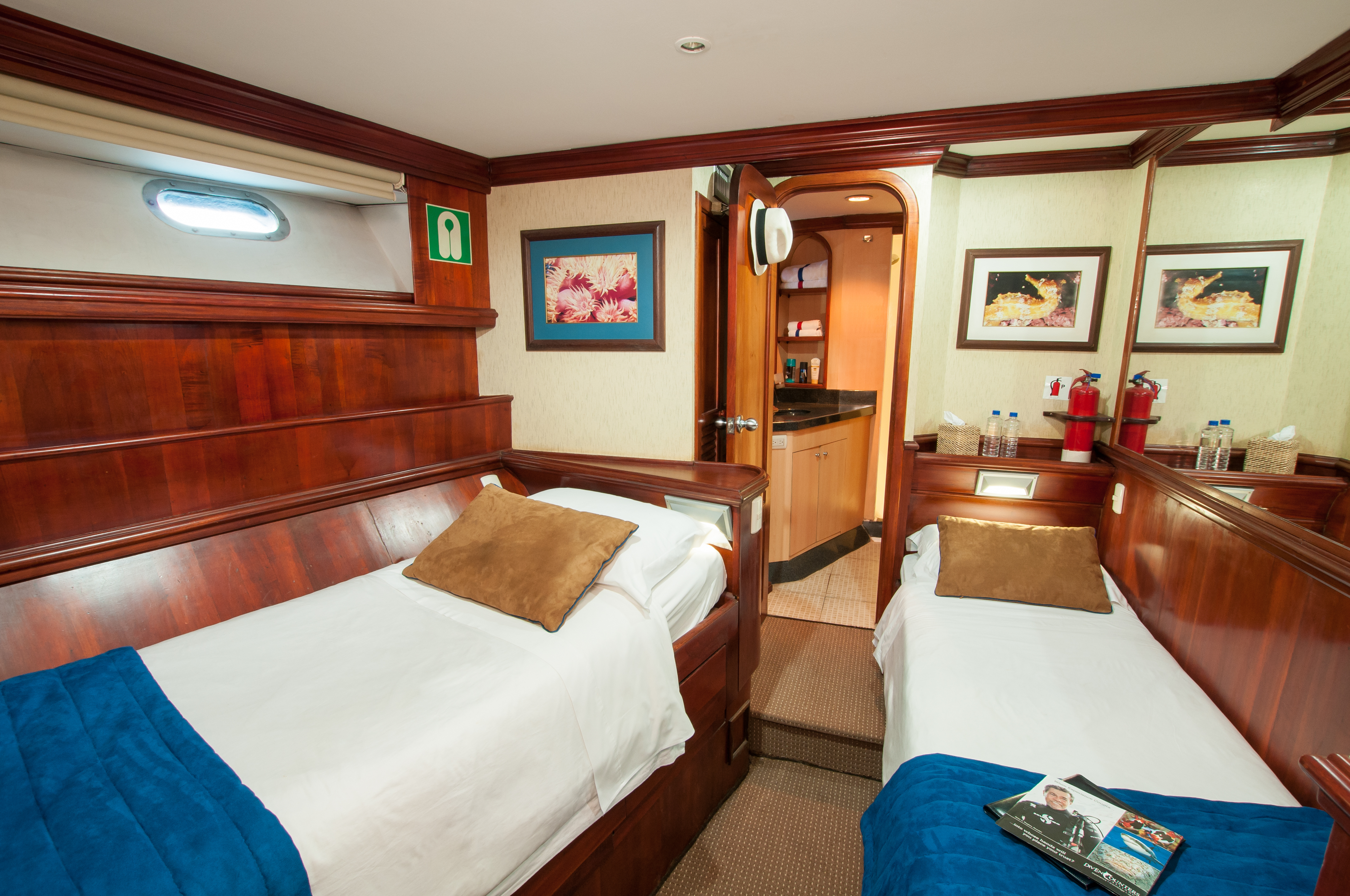 Accommodations include eight private en-suite cabins with two twin or one king size bed options. Each cabin features a private head/shower, mirrored cabinet and wardrobe, bathrobes, hairdryer, and marine safe (biodegradable) toiletries.