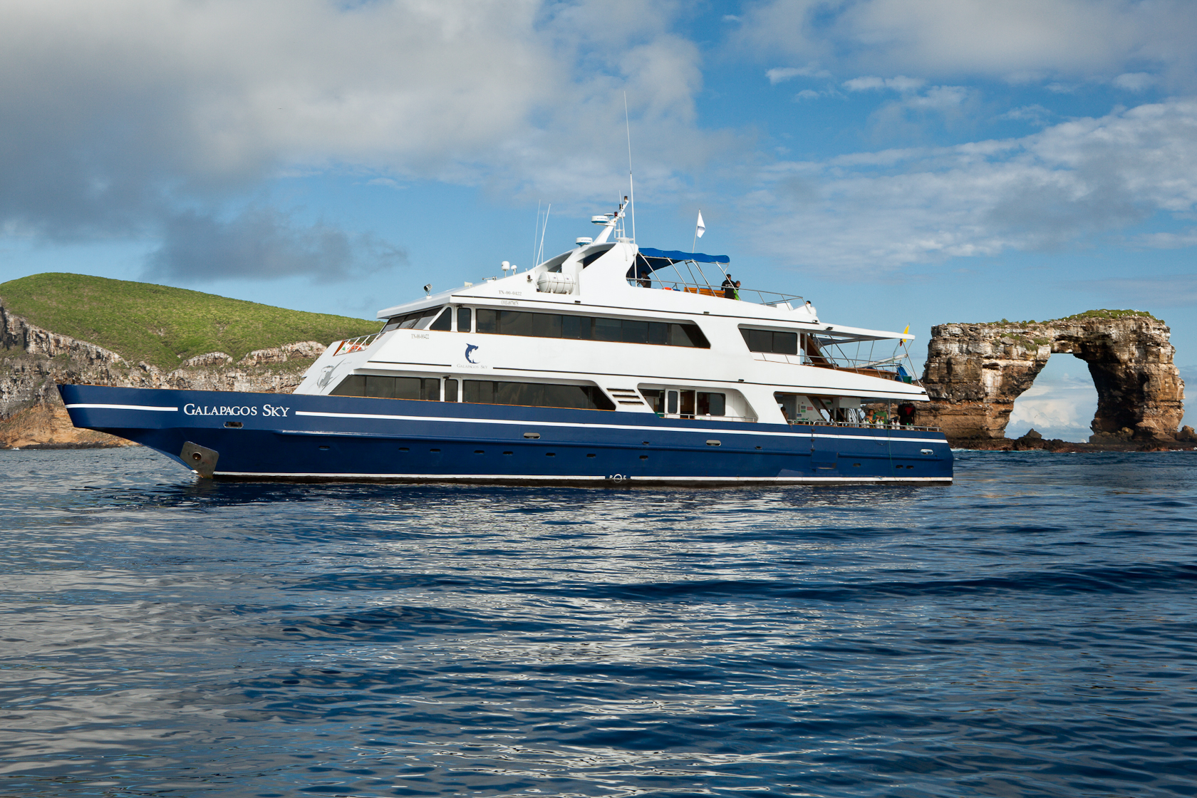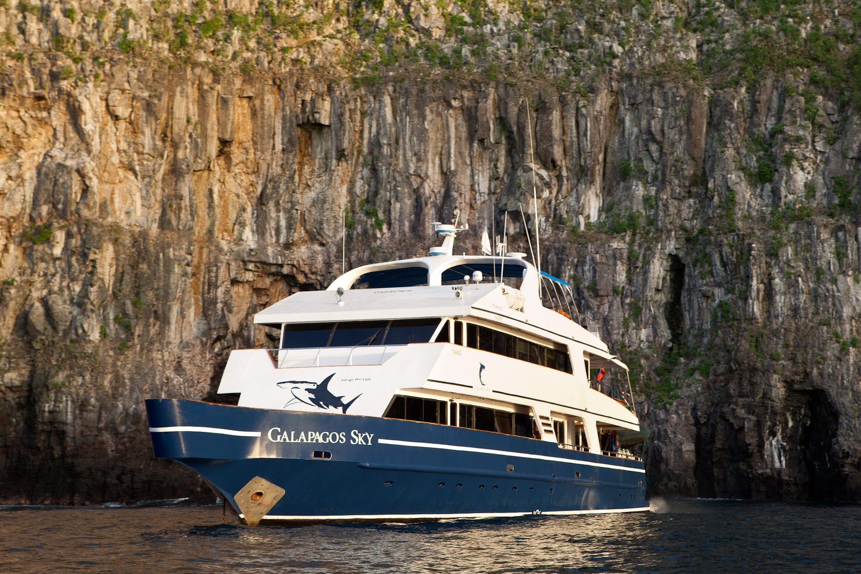 This 100 ft. (33m), 16 passenger luxury live-aboard yacht was launched in 2001 by owner Santiago Dunn. “Sky” has cruised the islands of the Galapagos Archipelago for nearly a decade – providing thousands of divers with high octane, extraordinary Galapagos diving experiences. The Galapagos live-aboard cruises also offer a full line-up of luxury accommodations, excellent food, “extra touch” amenities, and a friendly, helpful staff.