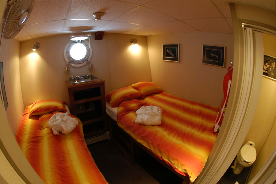 There is ample room to find a quiet place to read, chat, fill out your divelog or journal or work on editing the images you shot that day – whether in the separate dining room, main salon or one of the upper sundecks. And there is nothing like a soak under the stars in the sparkling clear fresh water of the hot tub after a day of diving or exploration. The main salon also serves as the ship’s entertainment centre with very “comfy” couches, a great library, a well stocked bar and select evening video showings, presentations and slide shows.