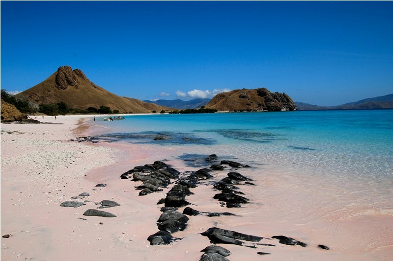1.30 hour boat ride: the pink beach at the foot of the Padar rugged rocky hills.