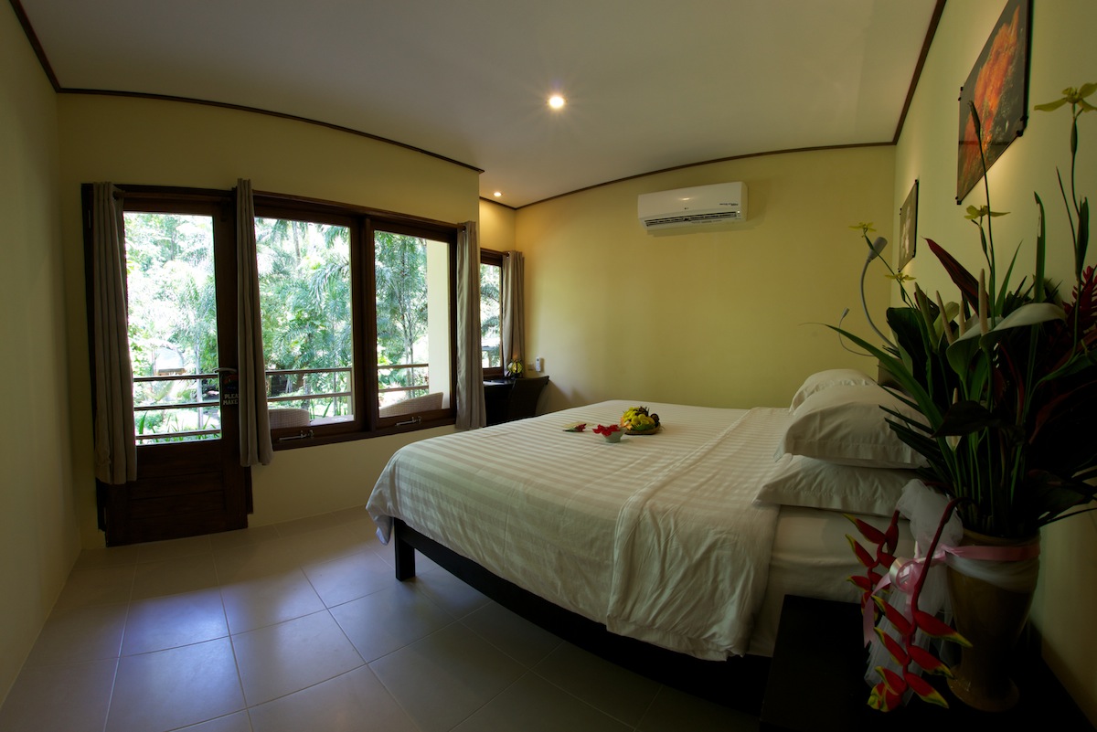 The very spacious Traditional Minahasan Cottages are fully detached and located along the front resort gardens, which are directly behind the waterline. Built from wood in the traditional style of the local Minahasan culture, with long covered wooden verandas, these cottages offer our guests beautiful sea views as well sunset views over Mount Klabat and other volcanoes.
