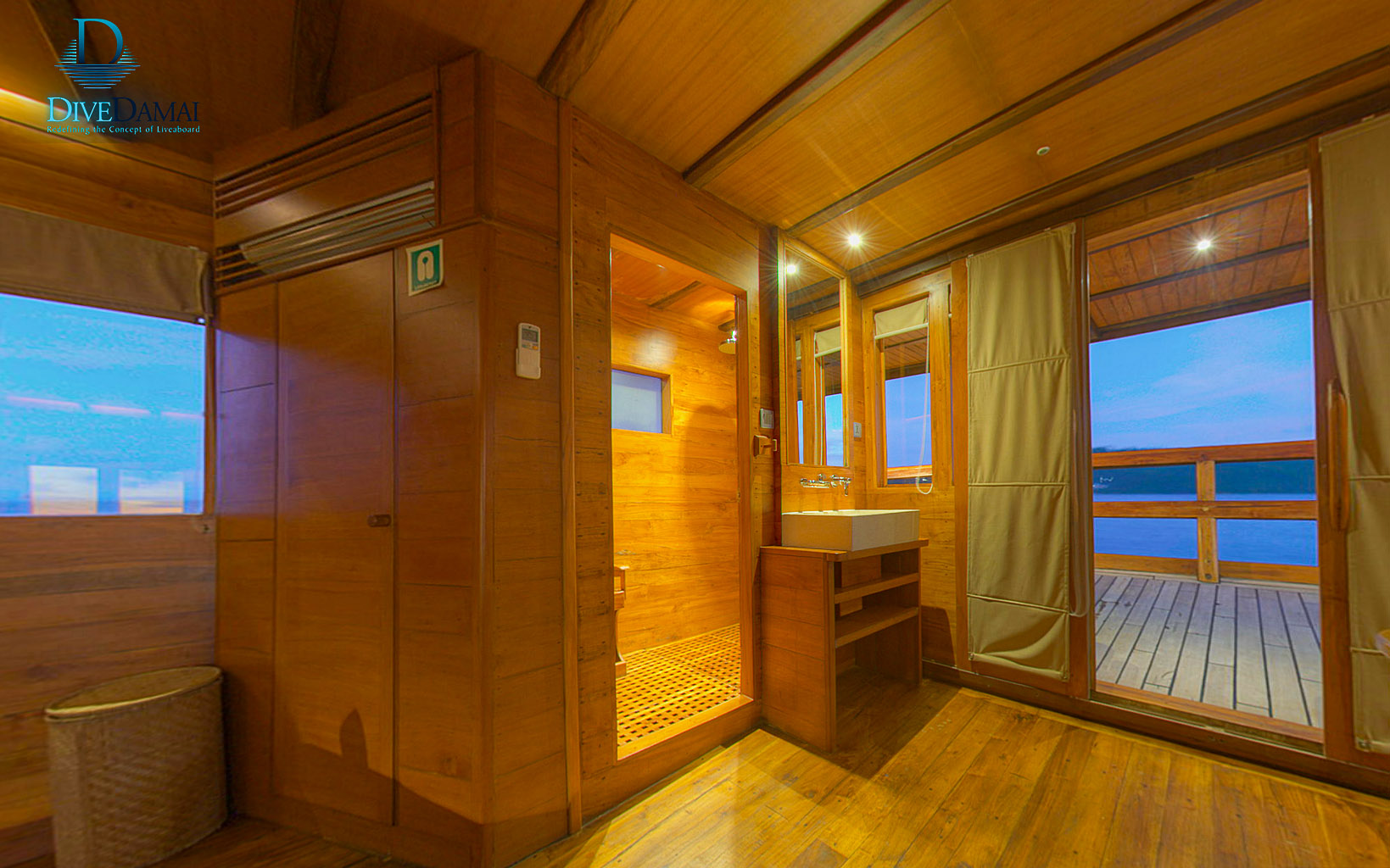 The below deck accommodation has been designed to accommodate single or twin occupants in a level of luxury not seen on another vessel in Indonesia. Each cabin boasts a private shower and head with a queen-size bed and a separate day bed. The cabins measure approximately 20sq.mts (225 sq.ft) each and have been finished with the highest quality furnishings. The stern staterooms are over 400 sq.ft each and boast their own private deck with loungers, a super-king size bed, day beds, two desks and ensuite shower and separate head.